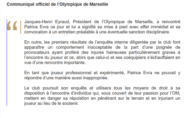 附马赛俱乐部官方公告: 马赛俱乐部主席埃洛德今日与埃弗拉进行会面,并通知他被立即停止一切足球活动,并将在埃弗拉可能受到进一步的处罚前,再次与他会面。 另外,俱乐部进行的初步调查结果显示,一小部分挑衅者对球员进行了不可接受的行为,他们在球员们为关键比赛热身时,发出特别严重的恶劣攻击。 作为一名职业的、经验丰富的球员,埃弗拉不应当使用这种不恰当的方式予以回应。 俱乐部将继续展开调查,也会使用所有法律手段去追究那些用对马赛的热爱作为伪装的球迷,这部分球迷进入场地侮辱球员,而不是去支持球员,危害了球门们的声誉。
