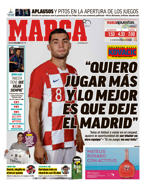 “我希望在皇马获得更多上场时间,因为我热爱足球,希望能上常我知道在皇马很难首发,特别是我来得时候还很年轻。我理解目前的处境,但对我来说,最好的情况是到一家能经常获得首发的俱乐部。”5月份接受采访的时候,科瓦契奇这样表示。