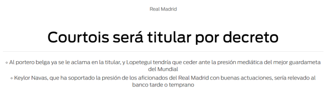 按照《每日体育报》的说法,在国际比赛日结束,西甲重新开战后,库尔图瓦将成为皇马的首发门将。皇马为引进库尔图瓦支付了3500万欧元,球队引进他可不是为了让他坐替补席,不管是上级的命令也好,是任人唯贤也好,总之,库尔图瓦将首发,纳瓦斯和洛佩特吉都很难顶住管理层、媒体以及球迷的压力。