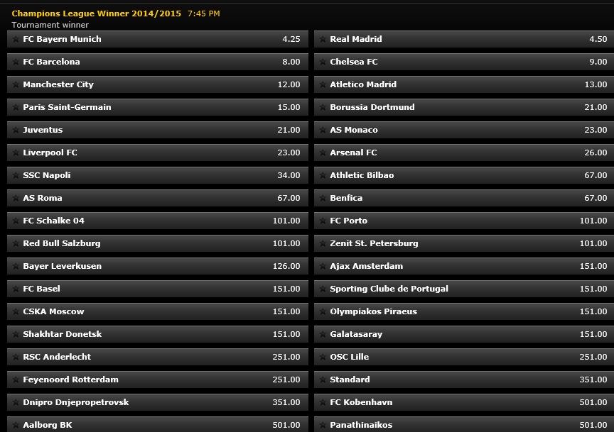 BWIN 2014/2015欧冠赔率