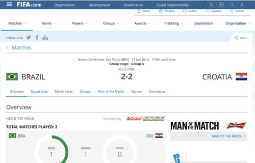 虽然比赛还没开始,但显然FIFA官网已经迫不及待了,有人发现,在FIFA官网,这场还未开打的比赛已经结束了。结果是巴西2-2克罗地亚。不知道这算不算是国际足联的官方预测。