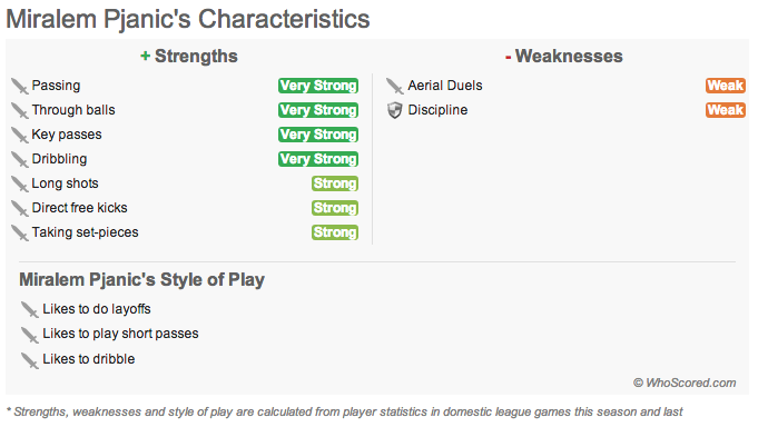 (图为WhoScored评定的皮亚尼奇的主要技术特点,其中左上方为强项,从上到下依次为:传球、直塞、关键传球、盘带、远射、直接任意球、定位球主罚;右上方为弱项,从上到下依次为:争顶、纪律性;下方为主要球风,从上到下依次为:喜欢做策应、喜欢送出短传、喜欢盘带。)