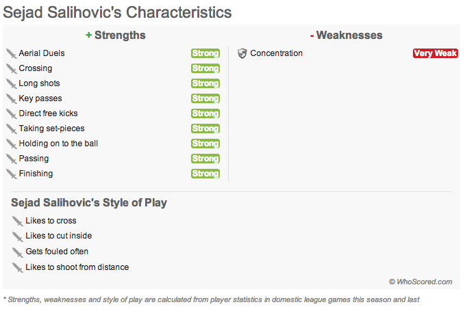 (图为WhoScored评定的萨利霍维奇的主要技术特点,其中左上方为强项,从上到下依次为:高空球争顶、传中、远射、关键传球、直接任意球、定位球主罚、控球、传球、终结能力;右上方为弱项,即注意力;下方主要球风,从上到下依次为:喜欢传中、喜欢内切、常被侵犯、喜欢远射。)