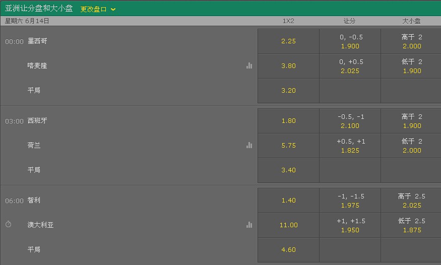 墨西哥喀麦隆都不太了解,我说的了解是指全面的了解,起码知道大部分球员和打法特点,只知道几个人的不算了解。不太准备参与,非要选的话,盘面上看墨西哥让平半值得小注搏,喀麦隆胜机不大。