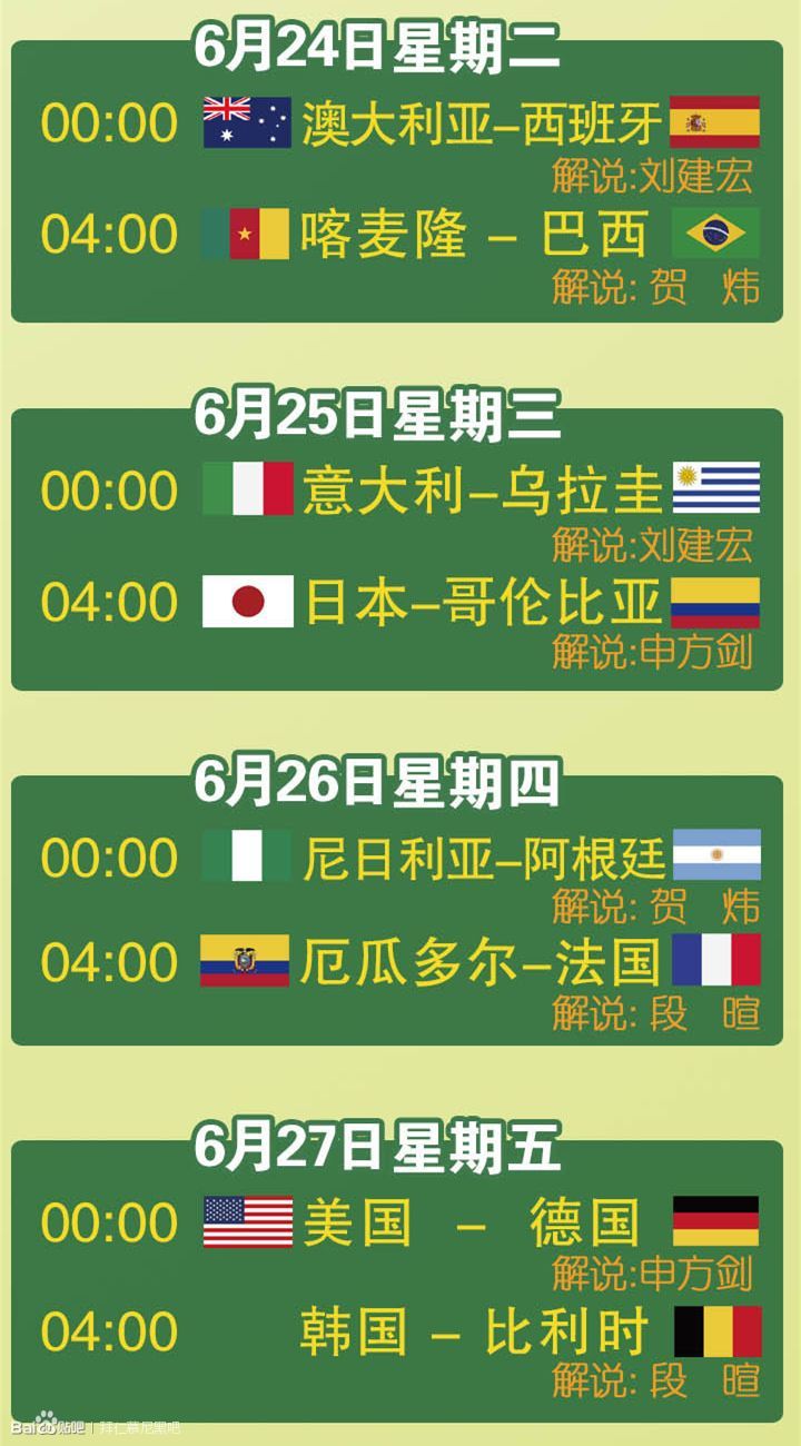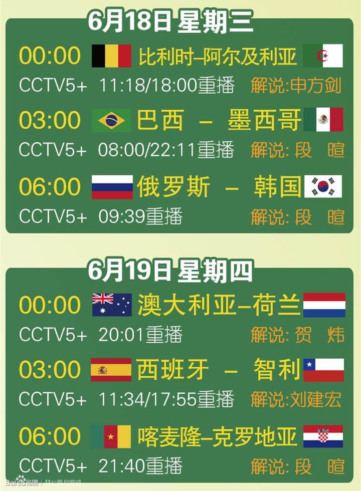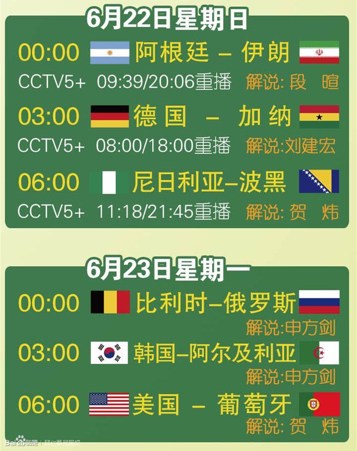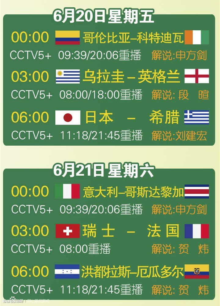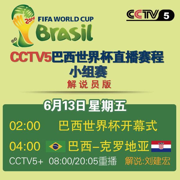 CCTV5世界杯小组赛直播赛程(含解说员及5+重播时间)