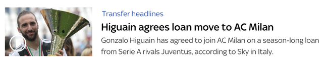阿根廷前锋伊瓜因已非常接近离开尤文图斯而加盟AC米兰,据《天空体育》最新的报道表示,伊瓜因已同意加盟米兰,只差尤文的分手费。 此前意大利转会专家迪马济奥表示,尤文与米兰谈妥了一份1800万-2000万欧元的1年租借+3600万欧元选择买断的协议。而如今伊瓜因已经同意加盟米兰,但与尤文还存在一定的经济分歧。《天空体育》表示,虽然伊瓜因同意加盟米兰,但他要求尤文图斯支付一笔遣散费,双方并没有因此谈拢。《意大利足球》则表示,这笔“忠诚奖励”的金额为450万欧元。