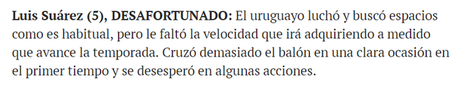 赛后西班牙《每日体育报》只给苏亚雷斯打了5分,这是巴萨的最低分数。评语表示:“和往常一样,乌拉圭人在拼争,在寻找空间,但他缺少速度。上半场一次大门,皮球太偏了,比赛中有些时刻他显得绝望。” 在西班牙《马卡报》的球迷投票中,苏亚雷斯得票数位列倒数第一。评语指出:“有时候他显得孤单,尽管如此,他还是获得了机会,但他射门缺少精准度。” 在WHOSCORED网评分中,苏亚雷斯只获得6.5分,也属于评分最低球员行列。他全场4次射门,2次命中,但没有取得进球。总共37次传球,失误9次,失误率有点高。比赛热图显示,苏亚雷斯跑动范围不小,但出现在有威胁区域的次数不多。