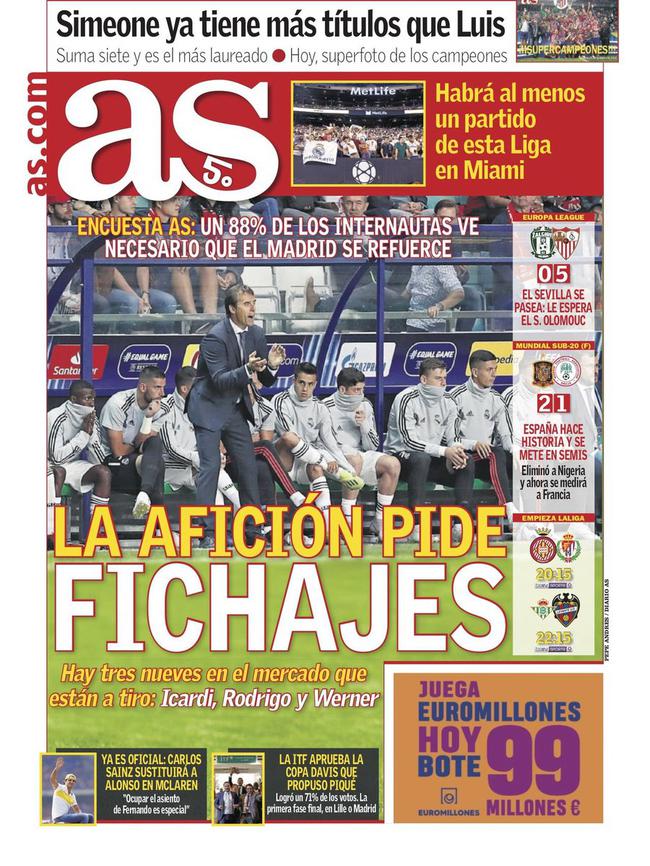 早些年弗洛伦蒂诺喜欢收购巨星级球员,他曾签下过齐达内、菲戈、贝克汉姆、罗纳尔多、卡卡、C罗和J罗等球星。但自2014年引进J罗之后,他再没有大手笔操作。C罗今年夏天离开,皇马需要大手笔操作以加强球队。皇马不是没有钱,而是皇马主席弗洛伦蒂诺不行动。 一场惨痛的失利,也让皇马球迷认识到,球队还需要在转会窗关闭前引进几名强援。《阿斯报》周五的封面打出了“皇马球迷要求引援”的大标题,称民意调查显示,88%的皇马球迷要求俱乐部引进球员加强球队。重点是锋线,罗德里格、伊卡尔迪和维尔纳是转会市场上可以操作的目标。