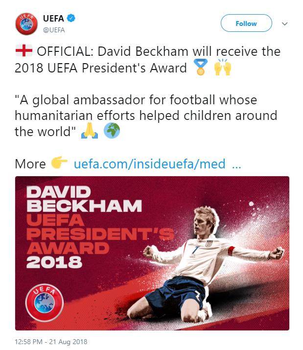 北京时间8月21日晚间,欧足联官方宣布,英格兰传奇球星贝克汉姆荣获2018年欧足联主席奖,他也成为了继罗布森爵士和查尔顿爵士后,第三位赢得该奖项的英国足球界人士。