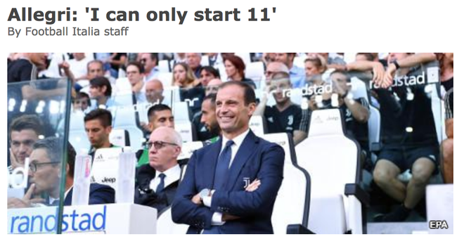“我综合选择了技术,均衡能力和身体素质的球员来确定首发阵容,但不意味着替补席上的人没机会出常我只能一次使用不超过11个人。” C罗没有进球,但他帮助曼朱基奇打进1球。对此,阿莱格里表示:“意大利足球与西班牙完全不同,C罗知道这一点,而且他的表现其实非常好。他是一个非常谦虚的人,我对他迄今为止所拿出的表现感到非常满意。”