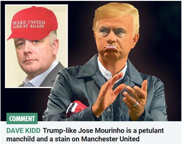 曼联在昨天的英超中完败给了热刺,球队主帅穆里尼奥赛后又成为焦点人物,他在赛后发布会上怒怼记者,表示自己拿过三座英超冠军,应得到更多的尊重。各路媒体都认为穆帅的表现很失态。《太阳报》首席体育记者戴夫-基德撰文炮轰穆帅像个任性的孩子,就如美国总统特朗普一样,如今穆帅已经成为了曼联的污点。