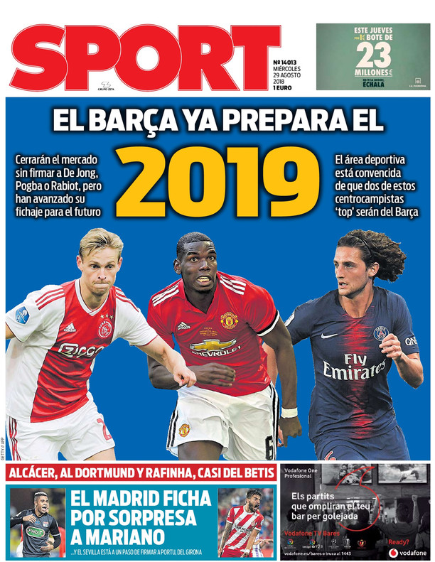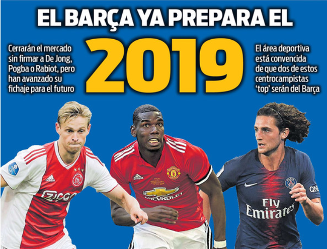 巴萨今夏已在转会市场引进了4名球员,看上去很难再引进第5位。然而,球队2019夏季的目标非常明确,届时他们将向这3人发起冲击。 周三的西班牙《每日体育报》封面打出了“巴萨开始为2019年做准备”的大标题,并将博格巴、拉比奥特和德容的照片放在了封面上。该报表示,今夏巴萨不会签下这三位球员,但俱乐部已经为未来的签约做好了准备。巴萨俱乐部高层相信,这三位顶级中场中的两位会加盟巴萨。 《每日体育报》表示,巴萨2019年夏天的计划变得非常清晰:必须继续加强中场,让中场来一次更新换代。要知道布斯克茨和拉基蒂奇已经30岁了,巴萨俱乐部可以考虑为他们的可能离开或者状态下滑寻找应对之策了。