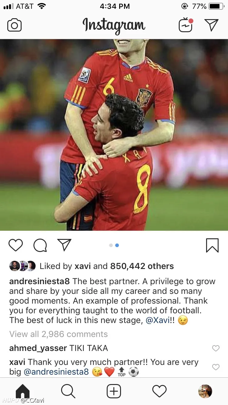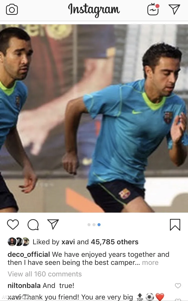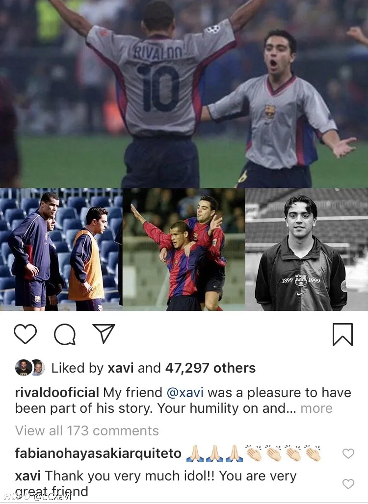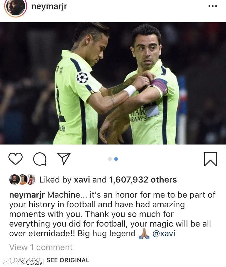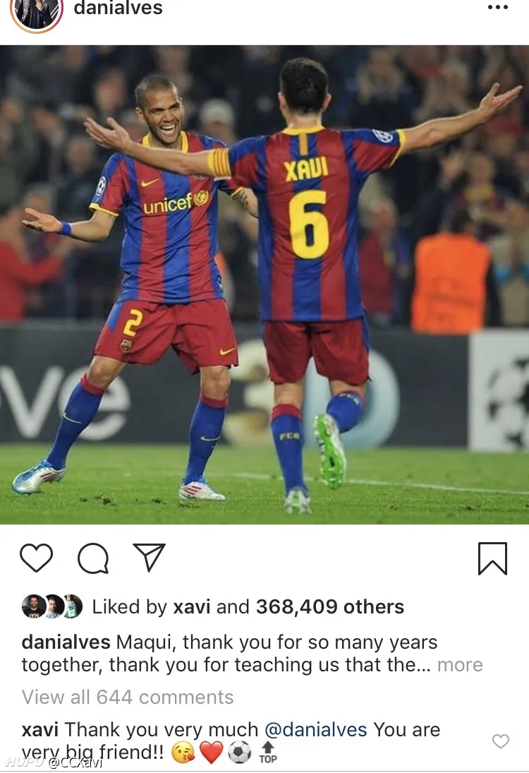 仅仅点了赞表示看过,但没有评论表示任何东西。内马尔选的还是他给哈维戴队长袖标的图。(因为马儿开启了限制评论所以评论里是白茫茫一片真干净)。 其他所有的祝他退役顺利的人他都点赞+回复了,包括只跟他踢了一年的苏牙和小狮子,还有只在年轻时候搭档过的克鲁伊维特和里瓦尔多(哈维还在评论里叫里瓦尔多idol,偶像),教练瓜,更不用说一些很长时间的其他队友小白、布酱、比利亚、托雷斯、普队、平托、雷纳、德科、梅西、二爷等等等等。 附送一个彩蛋:在哈维自己宣布退役的ins里,点赞大军里有隔壁的阿隆索和劳尔。 有意思,虽然这个不能直接暗示什么,但认为有必要跟大家分享一下