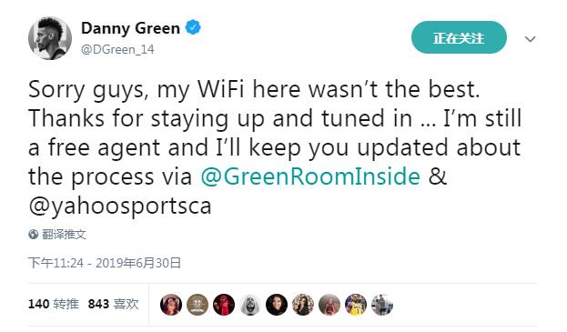 “抱歉伙计们,这里的WiFi信号不是太好。感谢大家一直熬夜等待结果。我仍然是一名自由球员,我的动态会在博客《Inside the Green Room》中更新。”丹尼-格林写道。